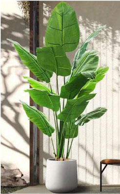 Τα μεγάλα, καρδιόσχημα φύλλα της σε βαθύ πράσινο με ανάγλυφες νευρώσεις αποδίδονται με εξαιρετικό ρεαλισμό, προσφέροντας έντονο διακοσμητικό αποτέλεσμα χωρίς τις απαιτήσεις ενός ζωντανού φυτού.