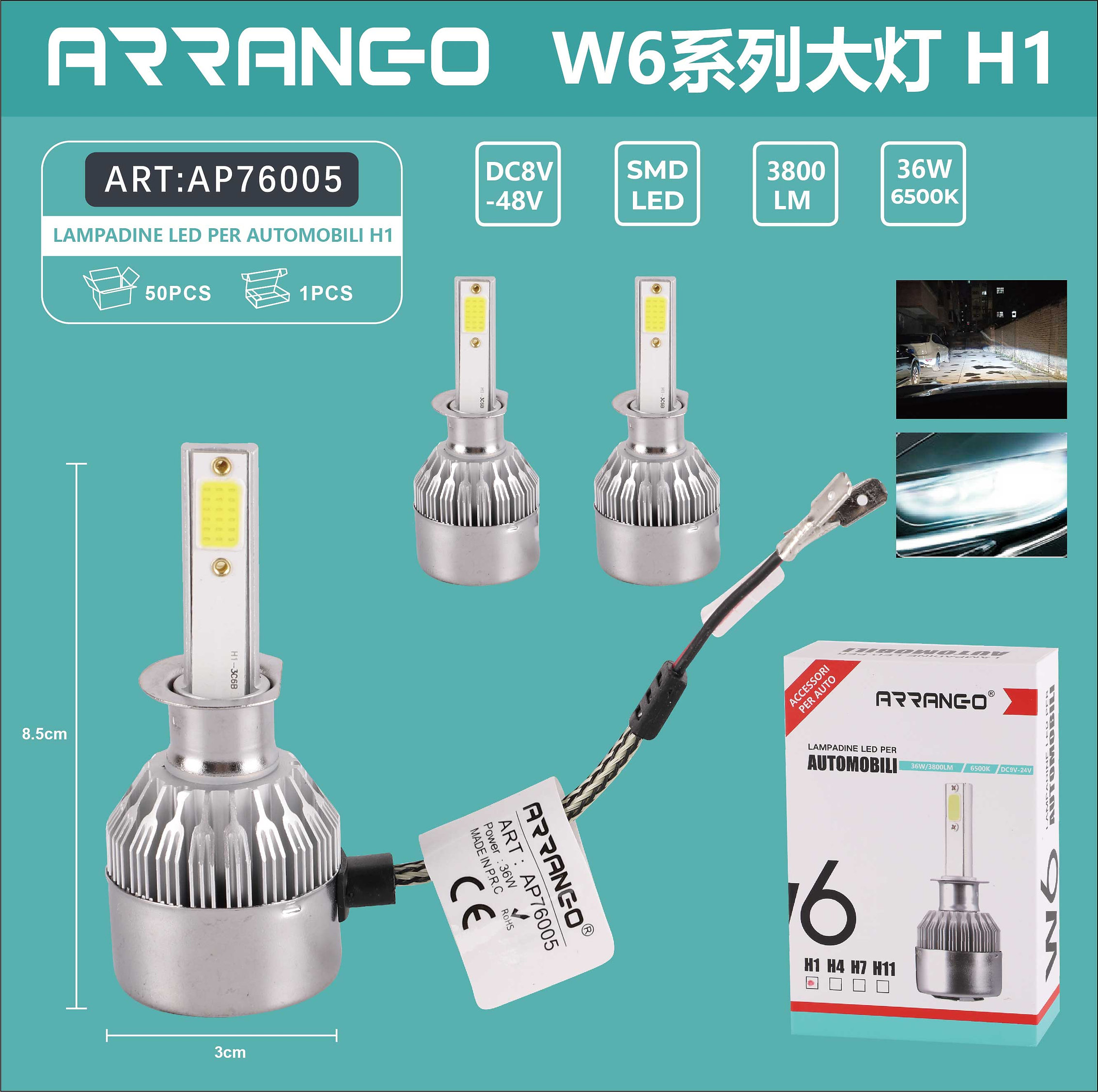 2x ARRANGO Λαμπτήρες LED SMD Φώτα Πορείας H1 36W 6500K W6 3800Lm