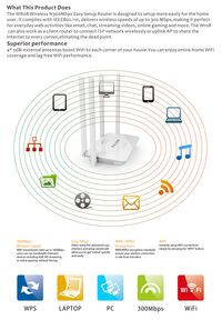 | Wireless Signal Rates (With automatic fallback) | 802.11b (11Mbps, 9Mbps, 6Mbps, 5.5Mbps, 2Mbps, 1Mbps) 801.11g (54Mbps, 48Mbps, 36Mbps, 24Mbps, 18Mbps, 12Mbps, 11Mbps, 9Mbps, 6Mbps) 802.11n (150Mbps, 135Mbps, 108Mbps, 65Mbps) |