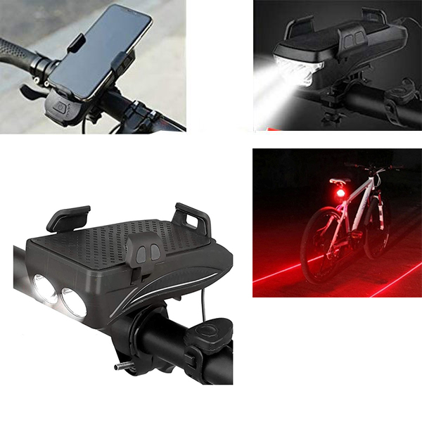 Αδιάβροχη USB Επαναφορτιζόμενη Βάση Κινητού Powerbank, Φως Πορείας, Οπίσθιος Φωτισμός LED & Κόρνα - Φακός LED 400lm Ποδηλάτου - LED Bicycle Horn Lamp Μαύρο