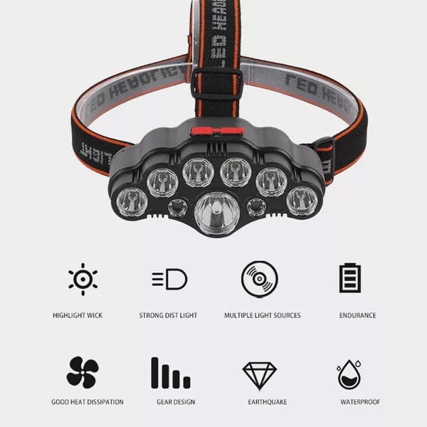 Αδιάβροχος Επαναφορτιζόμενος Φακός Κεφαλής με 9 LED - Δέσμη 230° έως 150m - 4 Λειτουργίες Φωτισμού & Ρυθμιζόμενη Κλίση - LED Super Bright Headlamp