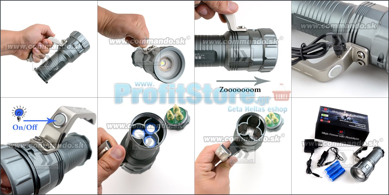 Μαζί με τον φακό θα πάρετε δώρο φορτιστή ρεύματος, φορτιστή αυτοκινήτου και 3x μπαταρίες 18650 επαναφορτιζόμενες.