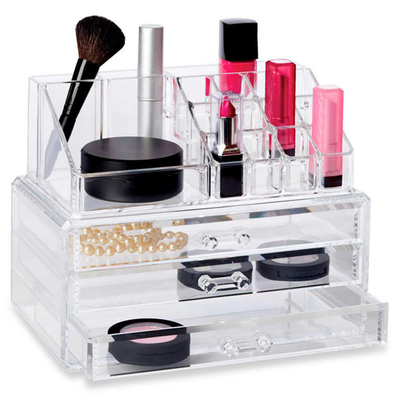 Ο οργανωτής μακιγιάζ διαθέτει 3 συρτάρια για να τακτοποιήσετε τα προϊόντα του μακιγιάζ σας ή τα κοσμήματα σας. Είναι κατασκευασμένος από διάφανο ακρυλικό plexiglass πολύ ανθεκτικό στις φθορές.