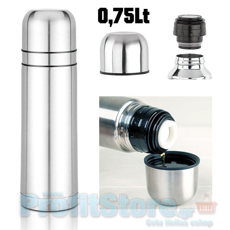 Θερμός ανοξείδωτο 750ml. Με μόνωση κενού αέρος και στόμιο ασφαλείας με βαλβίδα για ελεγχόμενη ροή. Με βιδωτό καπάκι - κύπελλο.