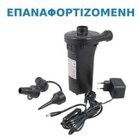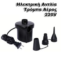 Ηλεκτρική αντλία αέρος 220V, κατάλληλη για φουσκωτά σκάφη και στρώματα με δύο λειτουργίες: Φούσκωμα & Ξεφούσκωμα. Διαθέτει 3 αντάπτορες για να προσαρμόζεται σε κάθε βαλβίδα.