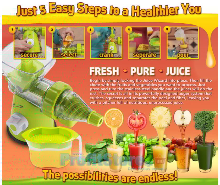 Σε αντίθεση με άλλους χειροκίνητους αποχυμωτές, ο Juice Wizard είναι εξαιρετικά ευέλικτος. Μπορεί να χρησιμοποιηθεί για να παράγει χυμό από πολλά φρέσκα φρούτα, λαχανικά και φυλλώδη πράσινα. Είναι μοναδικά σχεδιασμένος για να προσφέρει μια απλή και αποτελεσματική διαδικασία εξαγωγής - παρασκευής χυμού υψηλής ποιότητας και μεγάλης θρεπτικής αξίας, χωρίς να χρειάζεται η χρήση ηλεκτρικής ενέργειας.