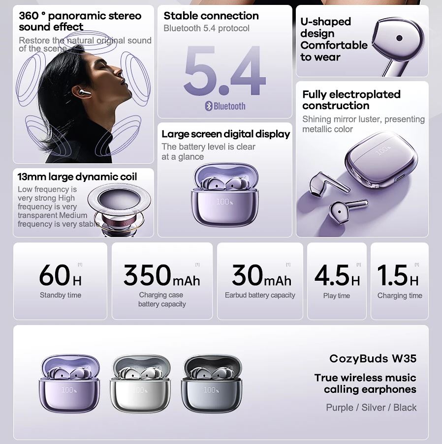 Με αυτονομία έως και 4,5 ώρες συνεχούς λειτουργίας και standby έως 60 ώρες, τα CozyBuds W35 καλύπτουν άνετα τις ανάγκες της ημέρας σας.
