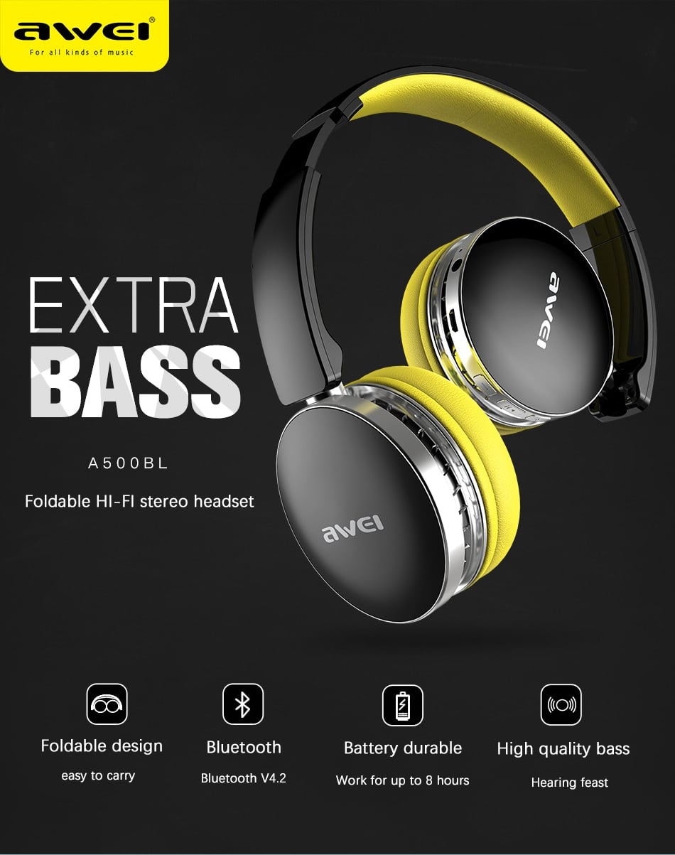 Ασύρματα & ενσύρματα on-ear bluetooth ακουστικά A500BL, υψηλής ποιότητας και αισθητικής, με είσοδο AUX Jack 3,2mm για σύνδεση με το κινητό ή κάποια άλλη εξωτερική πηγή ήχου με την εγγύηση της AWEI.