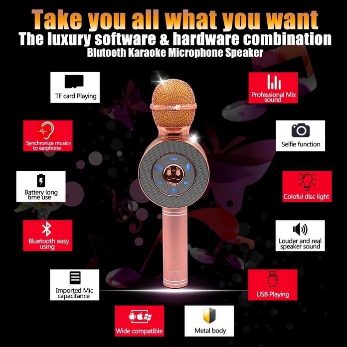 Ασύρματο Bluetooth Mικρόφωνο KARAOKE Hχείο Mp3 Player WSTER - Disco Light Microphone GOLD
