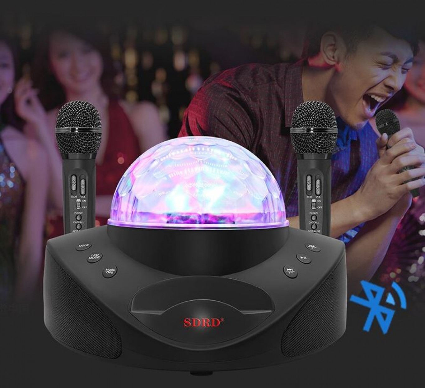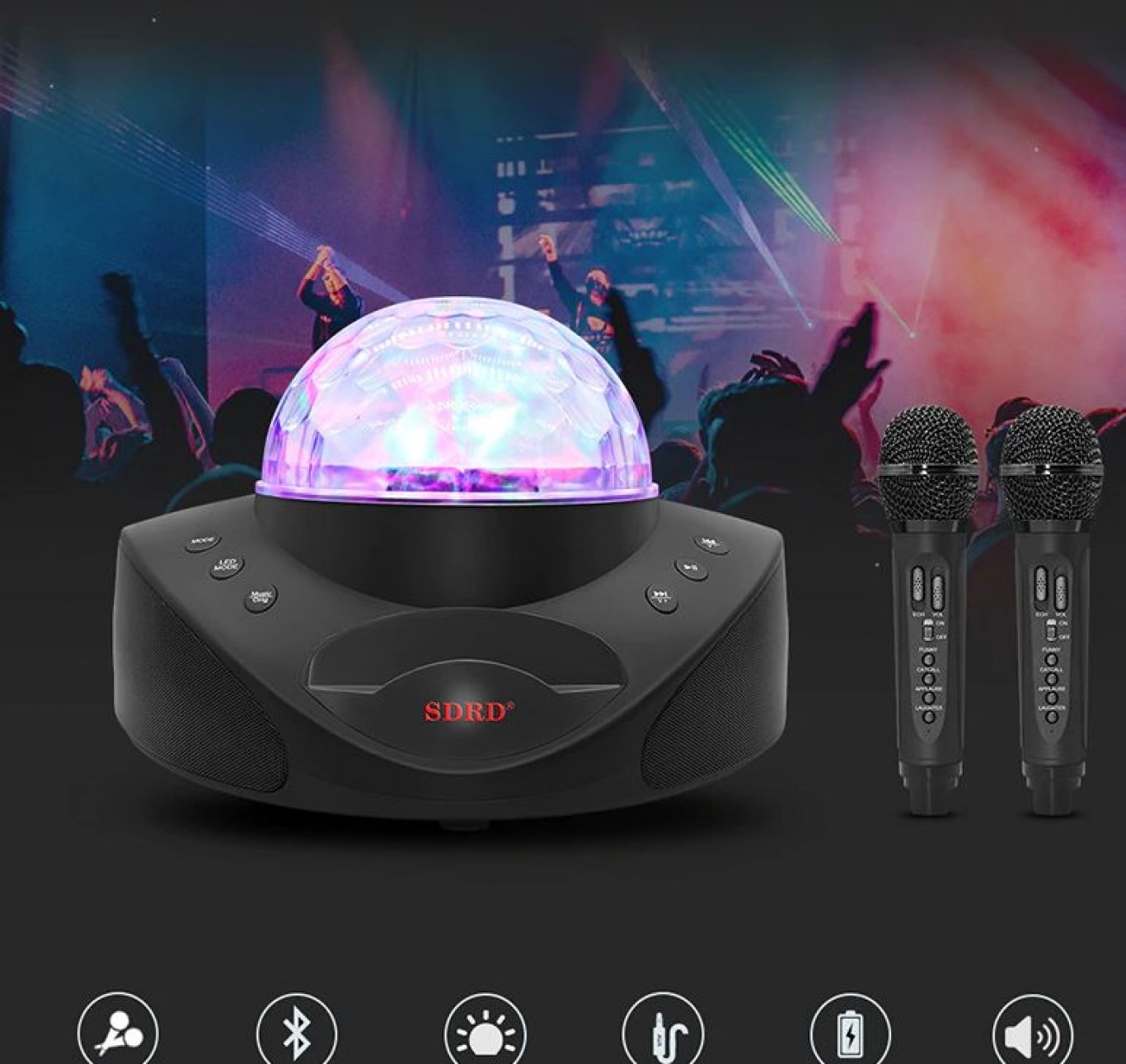 Bluetooth Φορητό Ηχοσύστημα Karaoke με 2 Ασύρματα Μικρόφωνα, Disco Crystal & USB,SD Player - 20W Μαύρο SDRD SD-308