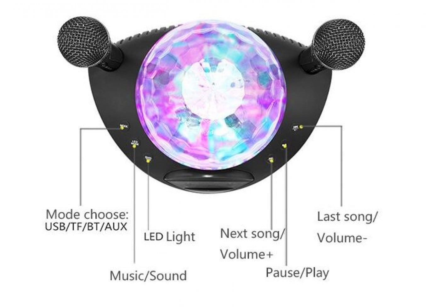 Εξαιρετικά δυνατό στερεοφωνικό Surround ηχείο 20Watt, 2 ασύρματα μικρόφωνα, Disco Crystal και USB/SD Player.