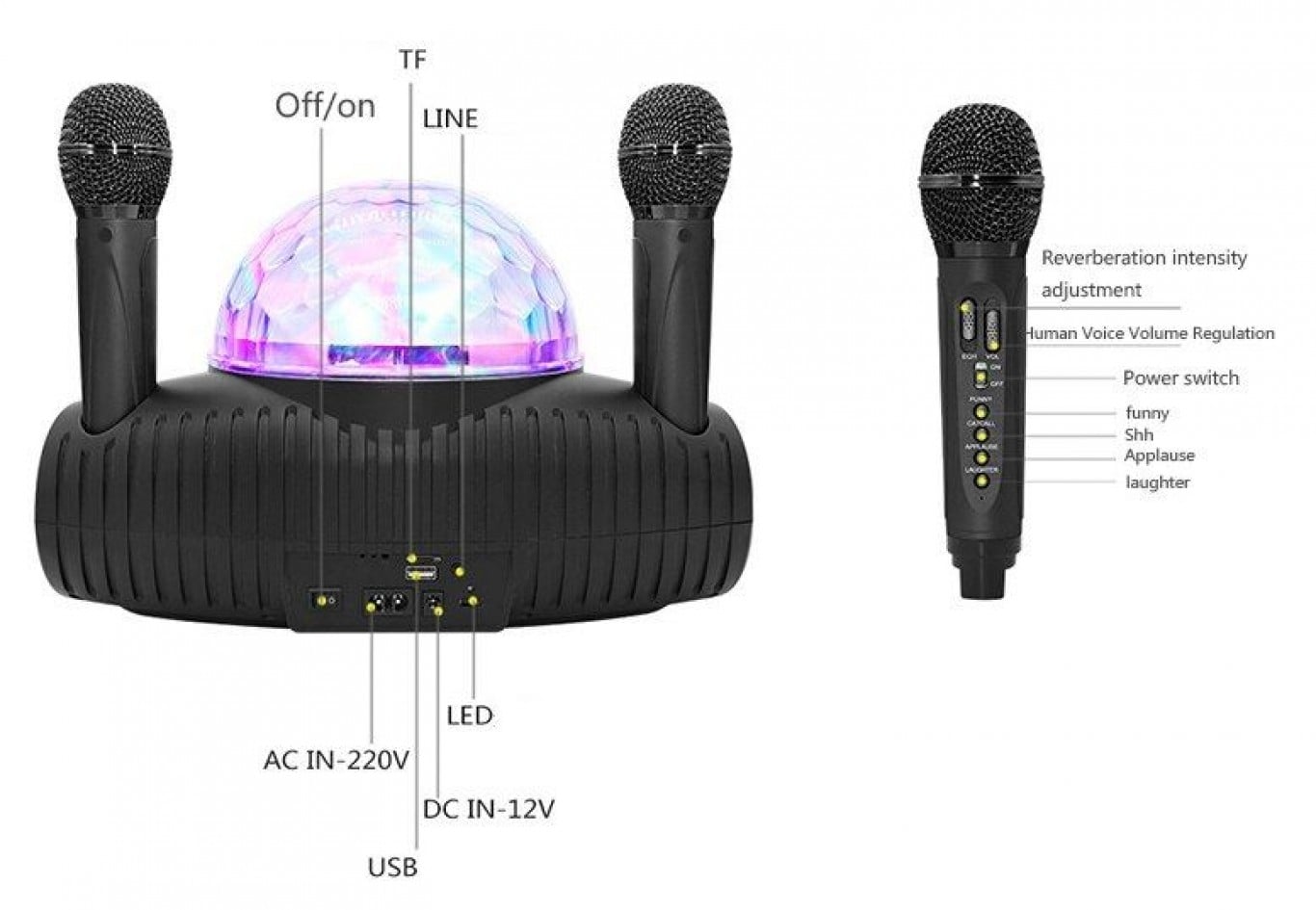 Λειτουργεί ως σύστημα ΚΑΡΑΟΚΕ κάνοντας μίξη κάθε πηγής ήχου ( SD card, USB, line in, bluetooth ) με τα 2 δυναμικά μικρόφωνα που περιλαμβάνει και αναπαράγει δυνατά και καθαρά μουσική και φωνητικά, ενώ