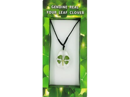Αυτό το μενταγιόν ως απλό σχέδιο, είναι ελκυστικό για τους άνδρες και τις γυναίκες όλων των ηλικιών. Η διαφάνεια της ρητίνης του, σας επιτρέπει να δείτε και τις δύο πλευρές του τετράφυλλου τριφυλλιού. Έχει ρυθμιζόμενο στιλάτο κορδόνι οπότε είναι ιδανικό σχεδόν για κάθε λαιμό. Αυτό το μενταγιόν περιέχει ένα πιστοποιημένο πραγματικό τετράφυλλο τριφύλλι από το φυτό Trifolium repens. Έρχεται έτοιμο σε ένα όμορφο κουτί, που λειτουργεί όχι μόνο ως εγγύηση γνησιότητας, αλλά περιέχει και πληροφορίες σχετικά με τα τριφύλλια τεσσάρων φύλλων, κάτι που το καθιστά ιδανικό για να δοθεί και ως δώρο.