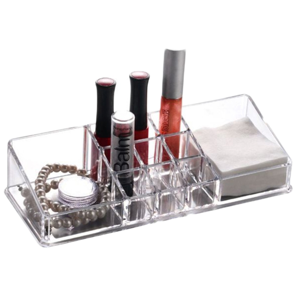 Είναι κατασκευασμένος από διάφανο ακρυλικό plexiglass πολύ ανθεκτικό. Το σχέδιο της είναι με 2 μεγάλες πλαινές και στη μέση μια τετράγωνη 9 μικρών θηκών για να τοποθετήσετε οποιοδήποτε προιόν καλοπισμού!