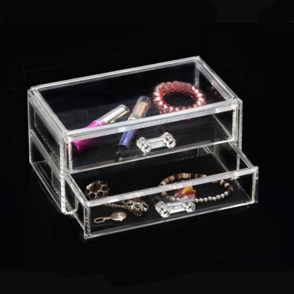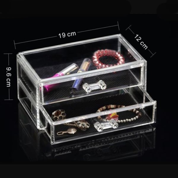 Είναι κατασκευασμένος από διάφανο ακρυλικό plexiglass πολύ ανθεκτικό. Το σχέδιο της είναι σε σχήμα ορθογώνιο με 2 συρτάρια, ιδανικά για την τοποθέτηση προιόντων καλοπισμού και ιδιαίτερα κοσμημάτων.
