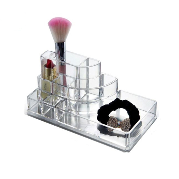 Είναι κατασκευασμένος από διάφανο ακρυλικό plexiglass πολύ ανθεκτικό. Το σχέδιο της είναι σε σχήμα ορθογώνιο με το μισό περίπου να περιλαμβάνει τετράγωνες θήκες διάφορων μεγεθών, ιδανικές για την τοποθέτηση προιόντων καλοπισμού και ιδιαίτερα κοσμημάτων, και η υπόλοιπη είναι κενή για να τοποθετήσετε οτιδήποτε θέλετε!