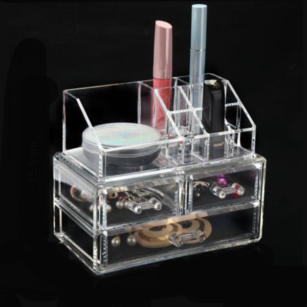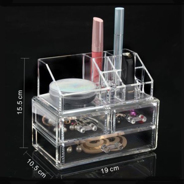 Είναι κατασκευασμένος από διάφανο ακρυλικό plexiglass πολύ ανθεκτικό. Το σχέδιο της είναι σε σχήμα ορθογώνιο με δυο επίπεδα, όπου το ένα περιλαμβάνει ένα μεγάλο συρτάρι, ενώ το άλλο δύο μικρά, ιδανικά για την τοποθέτηση προιόντων καλοπισμού και ιδιαίτερα κοσμημάτων, ενώ στην κορυφή βρίσκονται μία μεγάλη τετράγωνη θήκη και επιμέρους μικρες, για να τοποθετήσετε οτιδήποτε θέλετε!