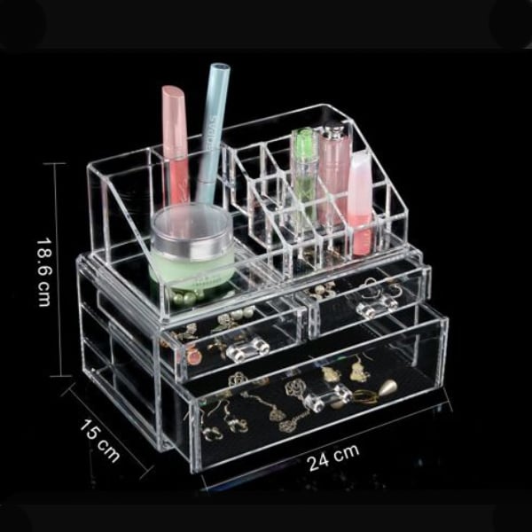 Είναι κατασκευασμένος από διάφανο ακρυλικό plexiglass πολύ ανθεκτικό. Το σχέδιο της είναι σε σχήμα ορθογώνιο με δυο επίπεδα, όπου το ένα περιλαμβάνει ένα μεγάλο συρτάρι, ενώ το άλλο δύο μικρά, ιδανικά για την τοποθέτηση προιόντων καλοπισμού και ιδιαίτερα κοσμημάτων, ενώ στην κορυφή βρίσκονται μία μεγάλη τετράγωνη θήκη και επιμέρους μικρές, για να τοποθετήσετε οτιδήποτε θέλετε!
