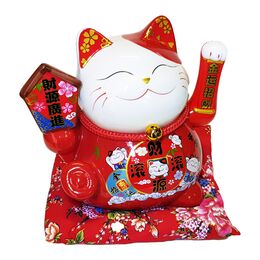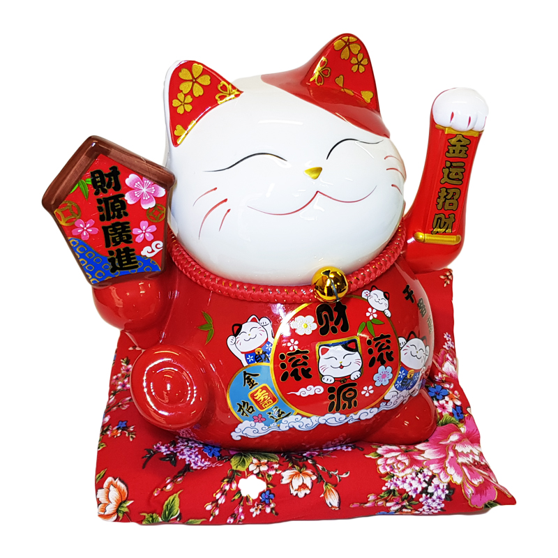 Η χαμογελαστή γάτα με το υπερυψωμένο πόδι προσελκύει πλούτο, καλή τύχη, ευημερία και καλωσορίζει στο χώρο σας φίλους ή νέα πελατεία (αν πρόκειται για χώρο εργασίας).