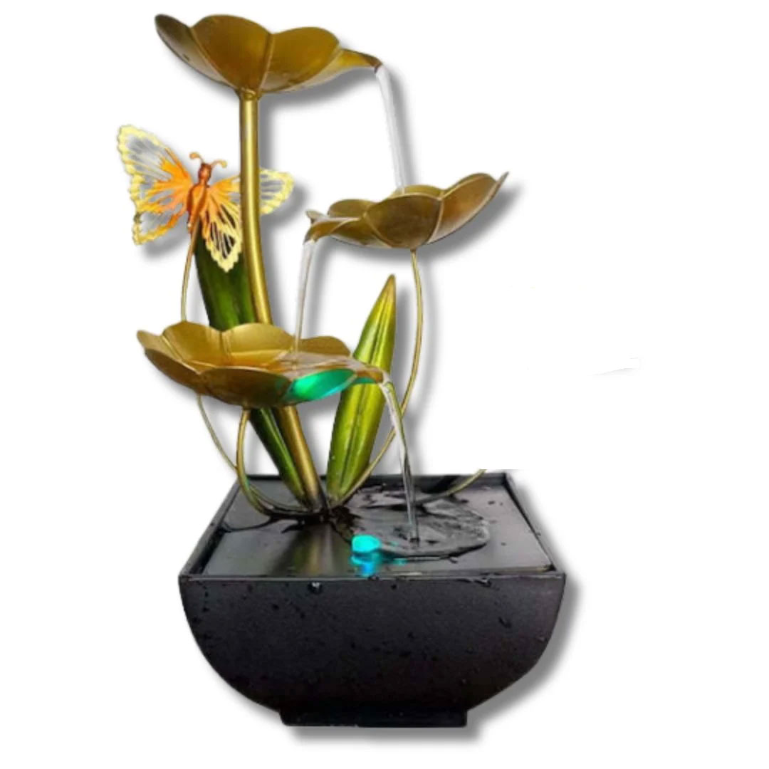 Το επιτραπέζιο συντριβάνι Feng Shui με χρυσά και πράσινα φύλλα, διακοσμημένο με μια λεπτοδουλεμένη πεταλούδα, δημιουργεί μια αίσθηση γαλήνης και φυσικής ροής.