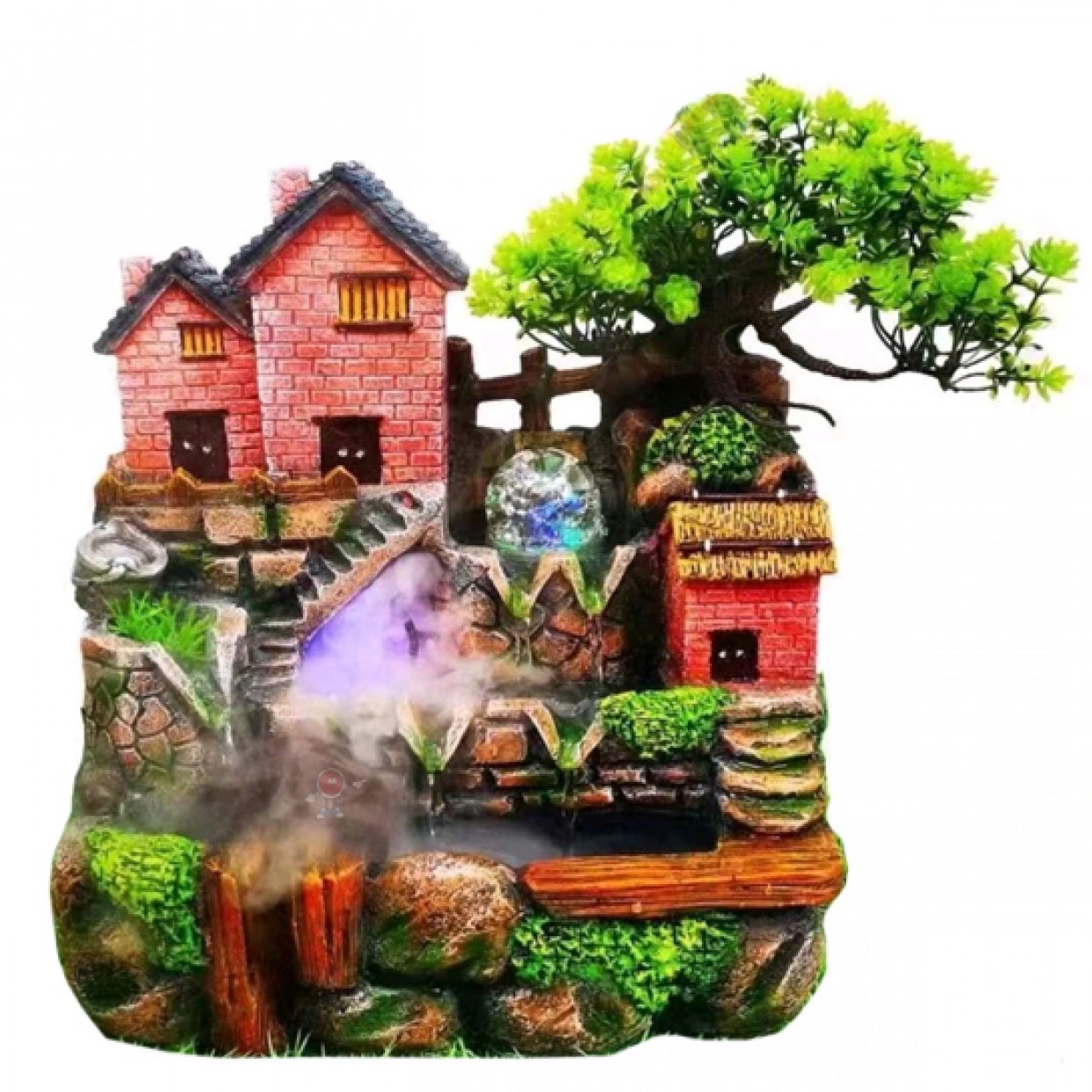 Διακοσμητικό Συντριβάνι Feng Shui με Σπιτάκι, Δέντρο, Τρεχούμενο Νερό & Πολύχρωμο Φωτισμό LED 30x20x31 εκ