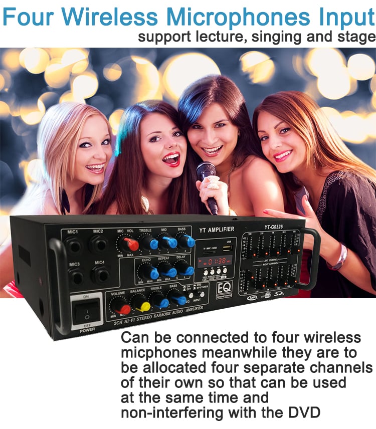 4 εισόδους μικροφώνων με ρύθμιση Treble-Mid-Bass-Echo-Repeat και Delay.