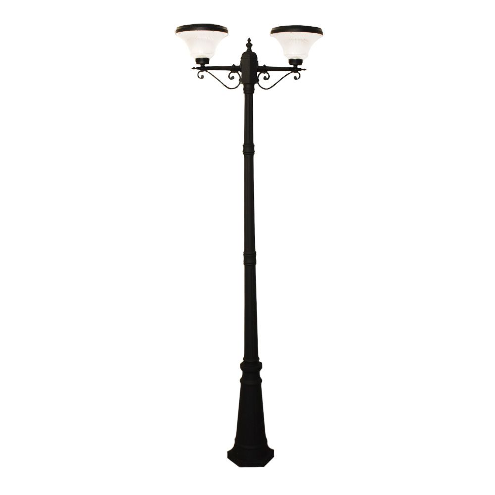 Διπλή ηλιακή κολώνα φωτισμού σε μαύρο χρώμα, που συγκεντρώνει και αποθηκεύει ηλιακή ενέργεια για τη λειτουργία της, ώστε να μη χρειάζεται να συνδεθεί σε παροχή ρεύματος.