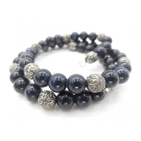 Υπέροχο ενεργειακό βραχιόλι με δύο σειρές με σφαιρίδια μπλε χρυσόλιθου (blue sandstone) και μεταλλικά στοιχεία, που προσαρμόζεται σε όλα τα μεγέθη και χαρίζει στον κάτοχό του τις μοναδικές ιδιότητες του λίθου.
