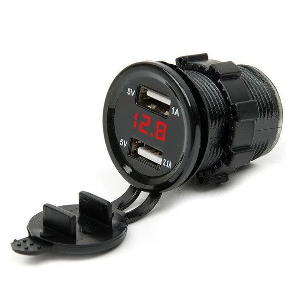 Αδιάβροχος φορτιστής με 2 εξόδους USB για ταυτόχρονη φόρτιση συσκευών. Διαθέτει οθόνη LED (διαθέσιμη σε 3 χρώματα) με βολτόμετρο, για μέτρηση της τάσης της μπαταρίας του οχήματός που είναι συνδεδεμένο.