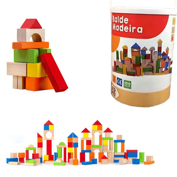 Το σετ περιλαμβάνει 100 ξύλινα τουβλάκια κατασκευής σε πολλά φωτεινά χρώματα, που ενθαρρύνουν τα παιδιά να εκφράσουν τη δημιουργικότητά τους και να δημιουργήσουν διάφορες μορφές και σχήματα.