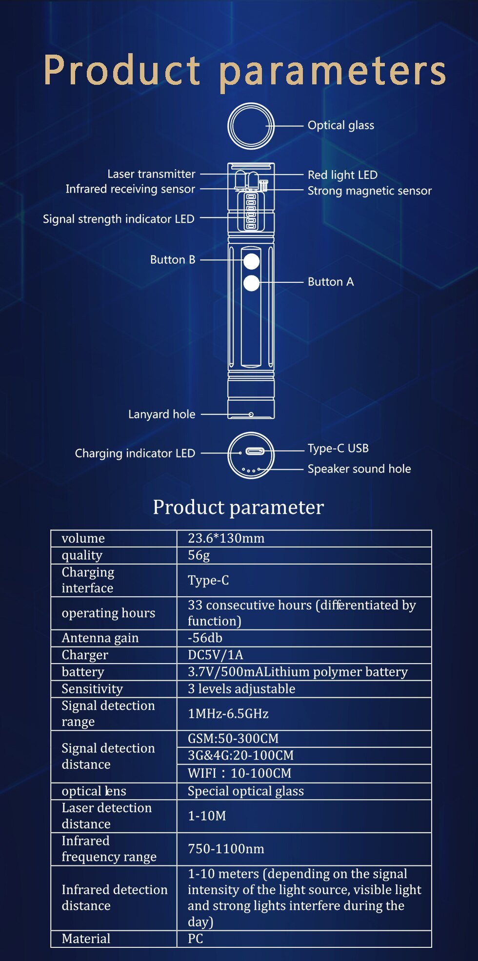 - Απόσταση ανίχνευσης: GSM 50-300cm, 3G&4G: 20-100CM, Wifi: 10-100cm, Laser: 1-10m,