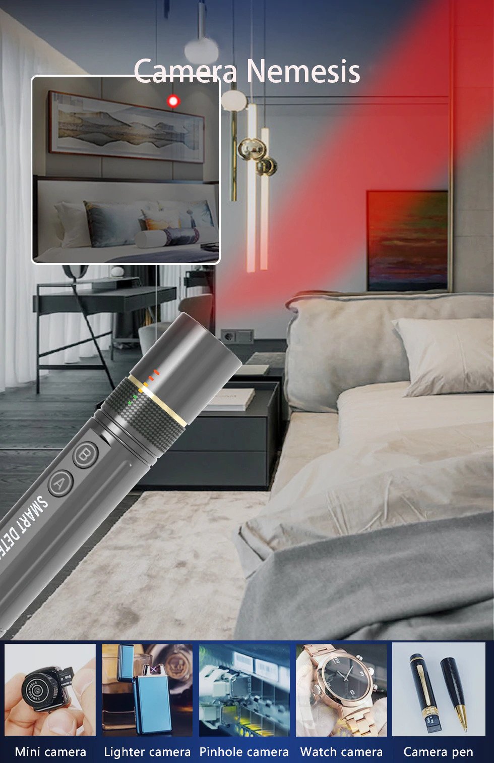 Ο ανιχνευτής διαθέτει λέιζερ που αντικατοπτρίζει τους φακούς οποιονδήποτε κρυφών φωτογραφικών μηχανών που μπορεί να κρύβονται γύρω από το δωμάτιο.Απλά σαρώστε το περιβάλλον σας με τη συσκευή, μέχρι να δείτε μια αντανάκλαση από το φακό της κρυφής κάμερας.