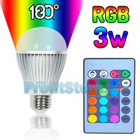 Ισχυρή RGB Led Λάμπα E27 3Watt με χοντρό σπείρωμα, για εξοικονόμηση ενέργειας και ατμοσφαιρικό φωτισμό μαζί με ασύρματο τηλεχειριστήριο για αυτόματη εναλλαγή 16 χρωμάτων. Αλλάξτε χρώμα στον χώρο σας με το πάτημα ενός κουμπιού! Προσφέρει διάχυτο φωτισμό 180ο.