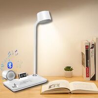 Πολυλειτουργική επιτραπέζια λάμπα LED με ηχείο Bluetooth, ασύρματο φορτιστή 15W και ψηφιακό ρολόι LED. Ρυθμιζόμενο ύψος και φωτισμός 3 επιπέδων. Ιδανική για γραφείο ή κομοδίνο. Διαθέσιμο σε λευκό και μαύρο χρώμα.