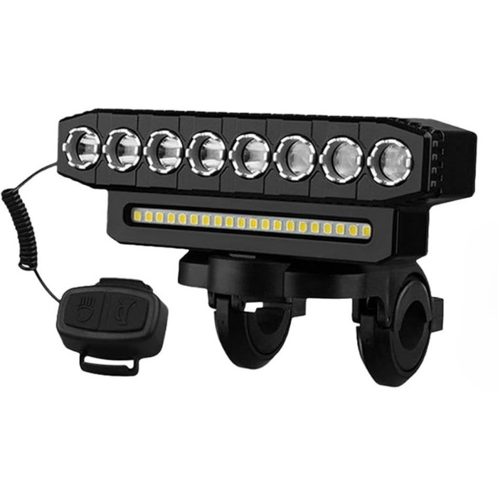 Εξοπλιστείτε για ασφαλείς και φωτεινές διαδρομές με το Rechargeable LED Cycle Front Light, ένα πανίσχυρο μπροστινό φως ποδηλάτου με 8 LED, πλευρική μπάρα 20 SMD και ενσωματωμένη κόρνα 130 dB για μέγιστη ορατότητα και ασφάλεια.