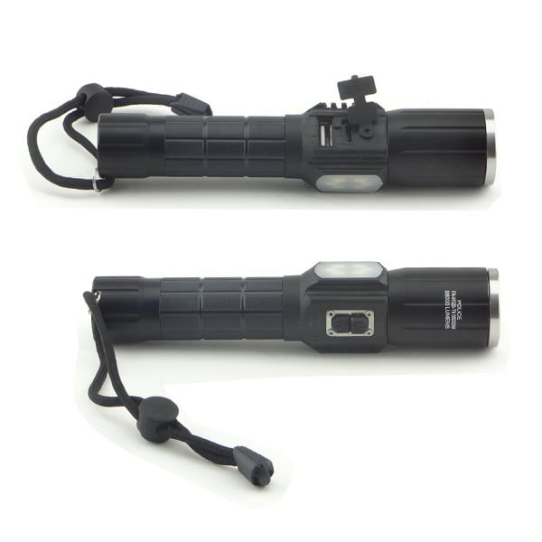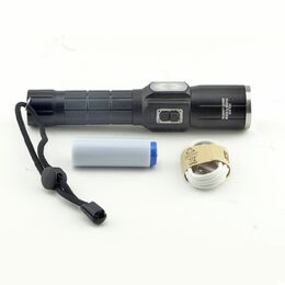 Η συσκευασία περιλαμβάνει: Φακό LED με ζουμ, μπαταρία επαναφορτιζόμενη, καλώδιο φόρτισης USB και θήκη για κανονικές μπαταρίες ΑΑΑ.