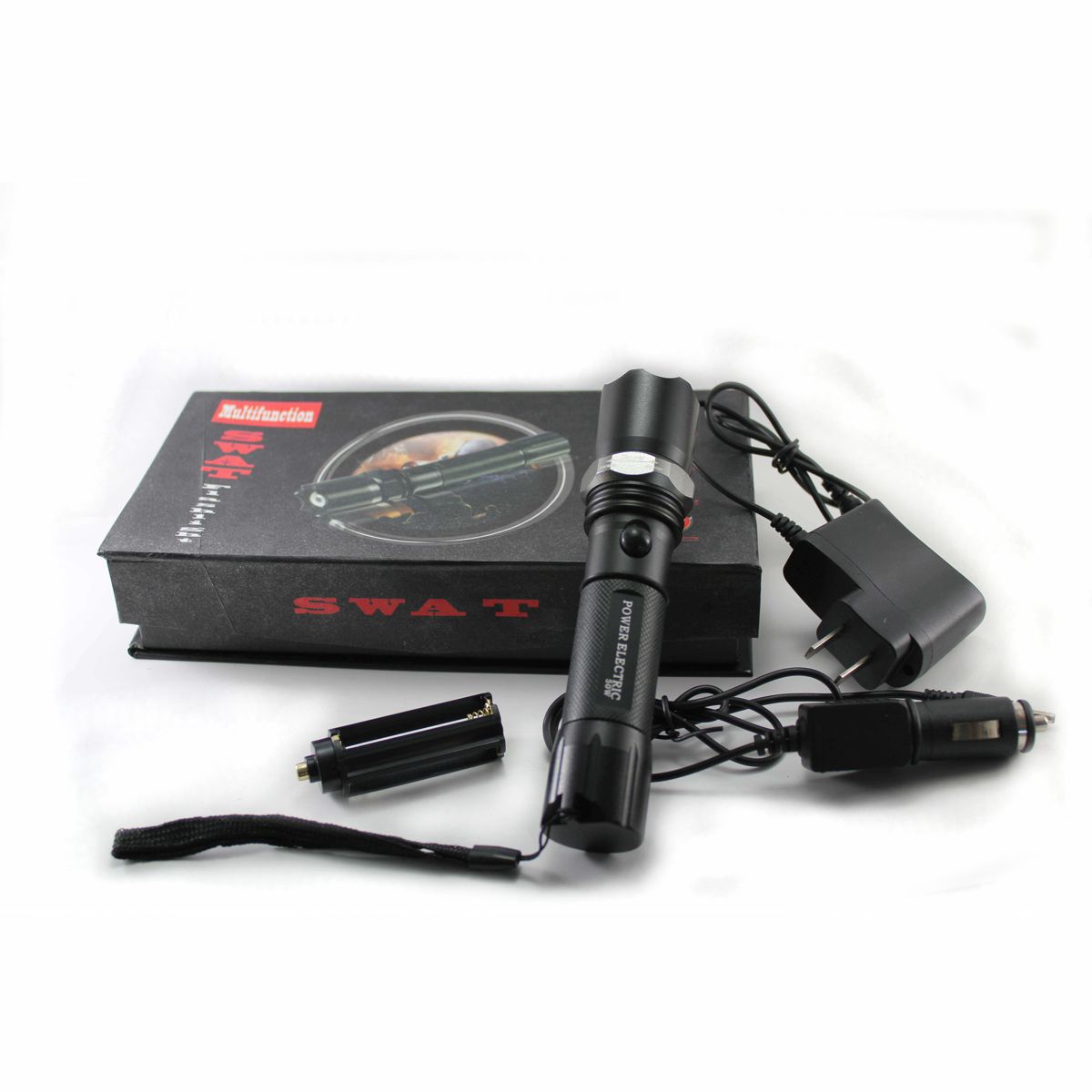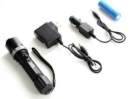 Η συσκευασία περιλαμβάνει: Φακό LED με ζουμ, θήκη για κανονικές μπαταρίες ΑΑΑ και δώρο μπαταρία επαναφορτιζόμενη, φορτιστή πρίζας και φορτιστή αυτοκινήτου.