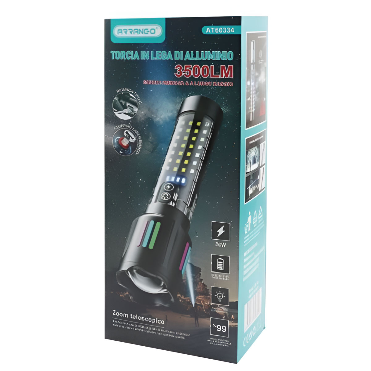 Ο επαναφορτιζόμενος φακός χειρός ARRANGO AT60334 προσφέρει εξαιρετικά ισχυρό φωτισμό 3500 lumens, ιδανικό για απαιτητικές συνθήκες σε εξωτερικούς και επαγγελματικούς χώρους.