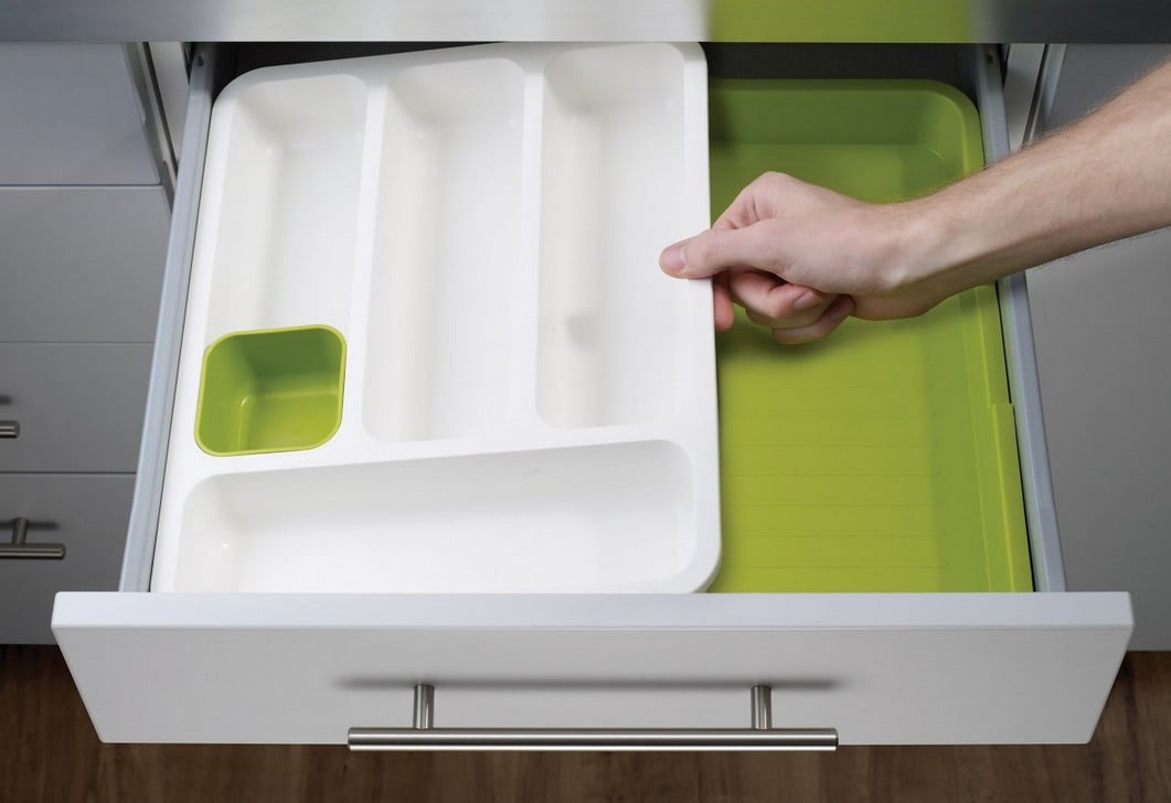 Αυτή η έξυπνη λύση αποθήκευσης διαθέτει τέσσερις θήκες που σας επιτρέπουν να διαχωρίζετε τα μαχαίρια, τα πιρούνια και τα κουτάλια σας, καθώς και μια περιοχή για μεγαλύτερα σκεύη ή μαχαίρια.