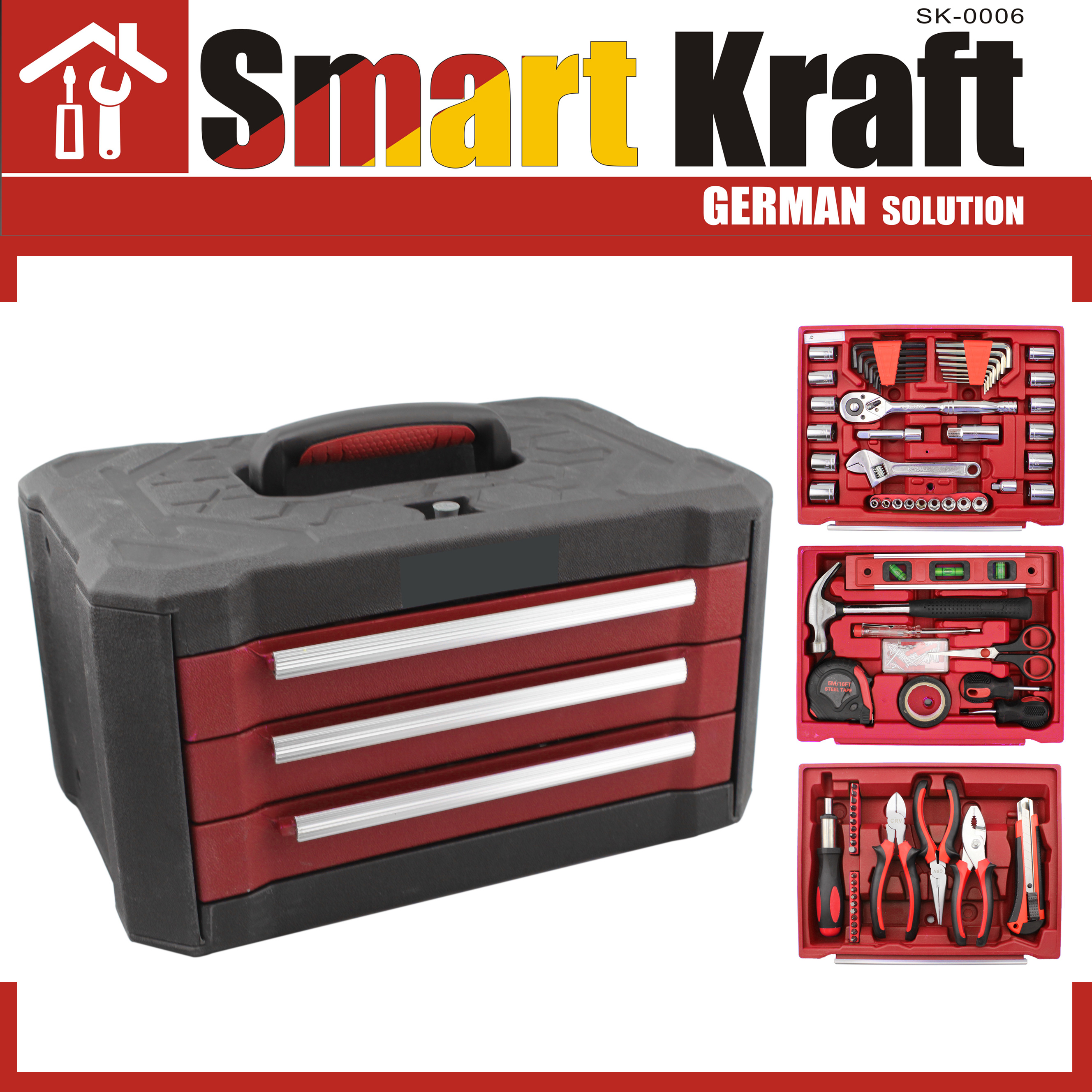 Με την εργαλειοθήκη SMART KRAFT SK-0006 θα έχετε όλα τα εργαλεία που χρειάζεται ακόμα και ο πιο απαιτητικός πολυτεχνίτης & πάντα μαζί σας αφού διαθέτει ροδάκια και αφαιρούμενα συρτάρια για πανεύκολη μεταφορά.
