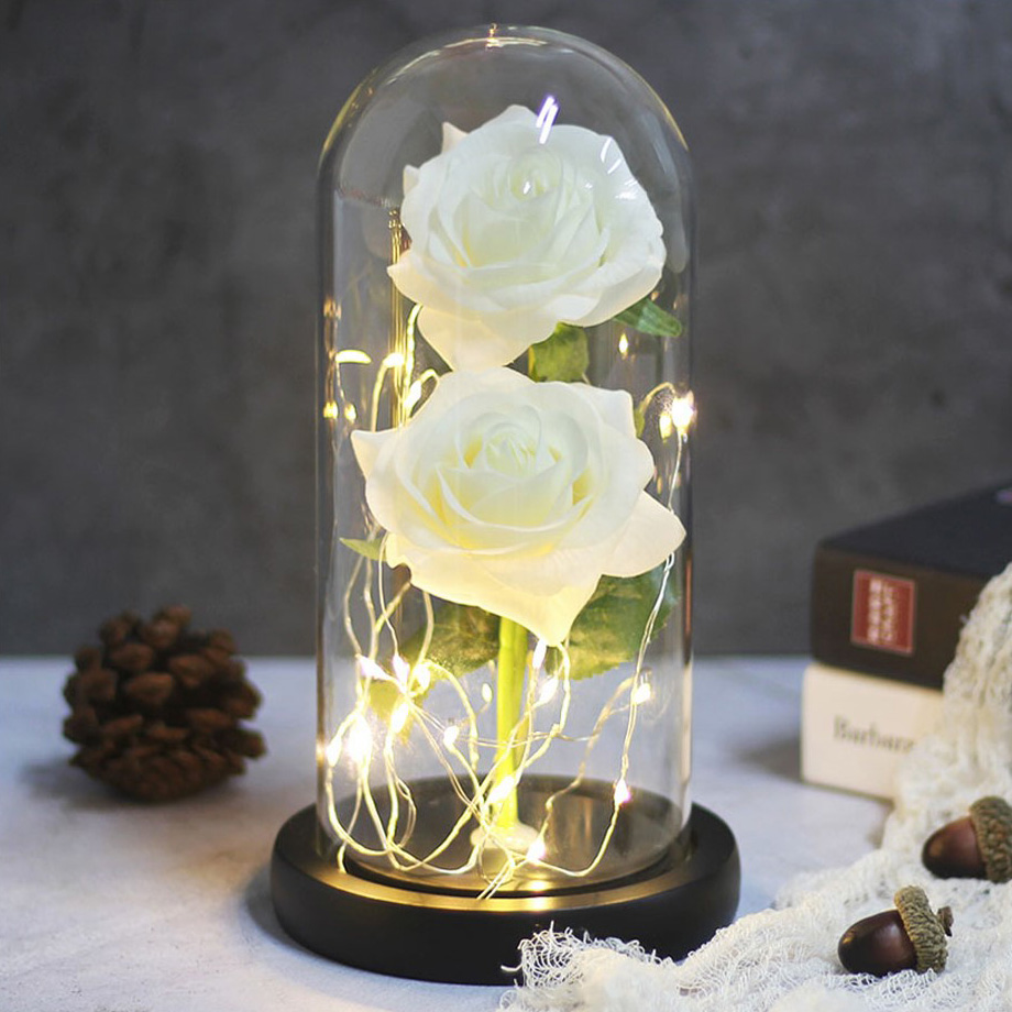 - 1 x Forever Rose 2 Παντοτινά Τριαντάφυλλα σε Γυάλινο Βάζο με Θερμό LED Φωτισμό 19x11cm - Λευκά