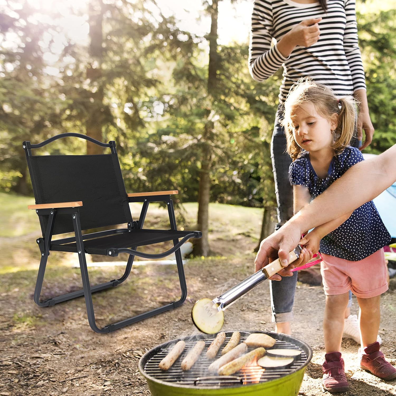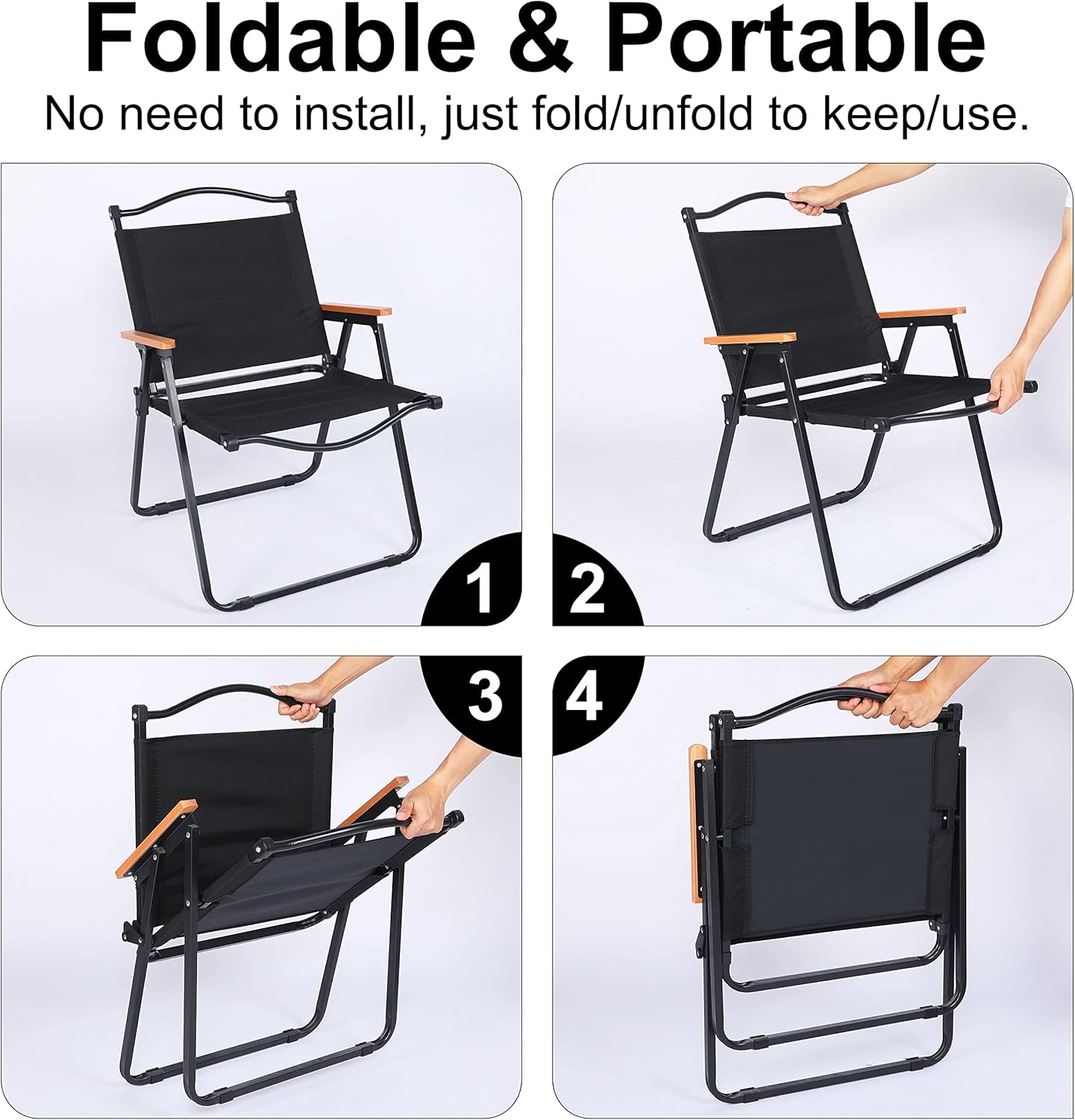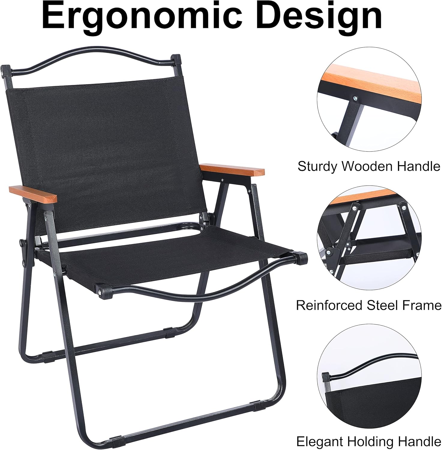 Το μαύρο χρώμα και οι ξύλινες λεπτομέρειες στα μπράτσα χαρίζουν διαχρονική αισθητική, ενώ η πτυσσόμενη δομή της εξασφαλίζει εύκολη μεταφορά και αποθήκευση.