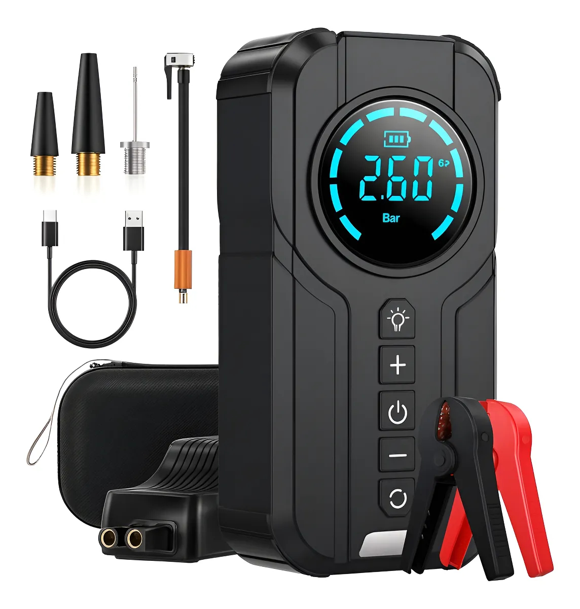 Φορητός σχεδιασμός και ισχυρή μπαταρία: Χάρη στη φορητή σχεδίαση και την ισχυρή μπαταρία λιθίου, μπορείτε να εκκινείτε το όχημά σας ή να φουσκώνετε ελαστικά, μπάλες και φουσκωτά αντικείμενα άμεσα και αποτελεσματικά.