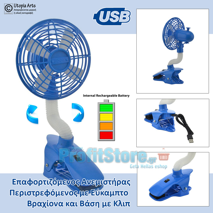 Φορητός Επαναφορτιζόμενος & Περιστρεφόμενος Ανεμιστήρας 12εκ με Βάση Μανταλάκι και Εύκαμπτο Βραχίονα