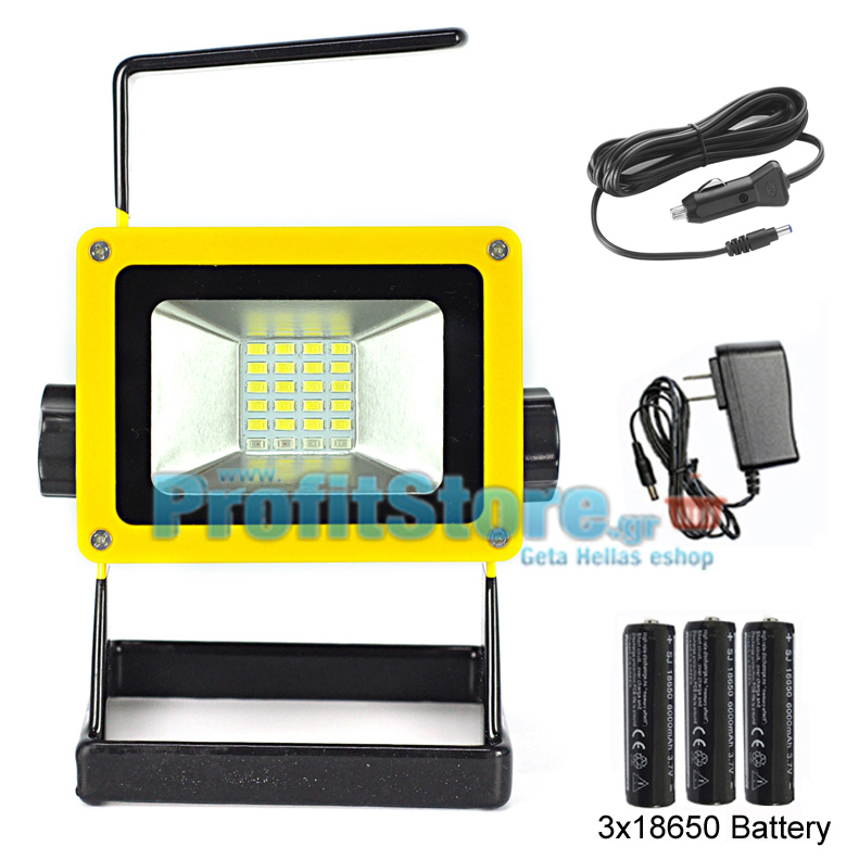 Φορητός προβολέας LED υψηλής απόδοσης 100W, με 3x επαναφορτιζόμενες μπαταρίες 18650. Φορτίζει και λειτουργεί και με ρεύμα από πρίζα 220AC ή με 12V από τον αναπτήρα του αυτοκινήτου ενώ τα καλώδια περιέχονται στην συσκευασία.