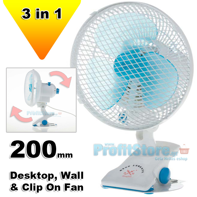 Εξαιρετικής λειτουργικότητας φορητός ανεμιστήρας 20cm, που μπορεί να λειτουργήσει ως επιτραπέζιος, επιτοίχιος ή να στερεωθεί με το ισχυρό κλιπ σε κάθε επιφάνεια.