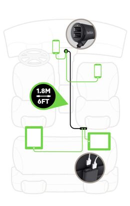 Φορτιστής αυτοκινήτου Belkin για επιβατικά αυτοκίνητα με 4 θύρες extended USB. Παρέχει 2 θύρες φόρτισης για τον οδηγό και τον συνοδηγό στον αντάπτορα για τον αναπτήρα και 2 θύρες USB στον αντάπτορα στο καλώδιο επέκτασης για τους επιβάτες στα πίσω καθίσματα.