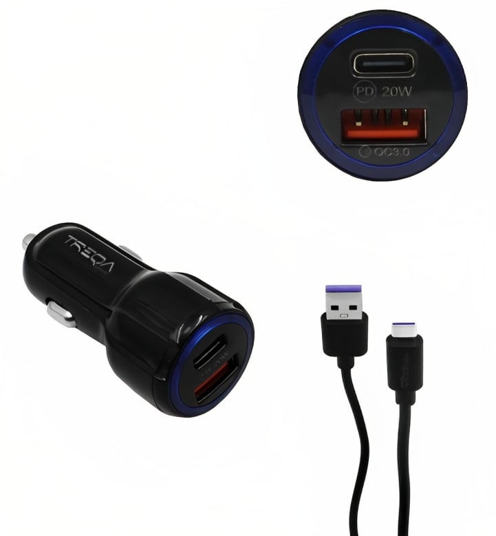 Φορτιστής Αυτοκινήτου Ταχείας Φόρτισης 12V – 24V με Θύρα USB-A 3.1Α και Θύρα USB-C PD 20W και Καλώδιο TypeC - Treqa