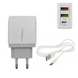 Φορτιστής Ταχείας Φόρτισης με 2 Θύρες USB 5.4A, 1 θύρα USB-C PD 38W και Καλώδιο USB TypeC - Treqa