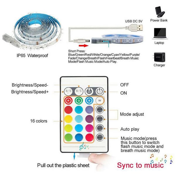 Ταινία LED με ρυθμιστή φωτεινότητας 16 χρωμάτων, 6 διαθέσιμες λειτουργίες εναλλαγής φωτισμού και τηλεχειριστήριο 24 πλήκτρων, για να μπορείτε να αλλάξετε το χρώμα και τη λειτουργία πατώντας απλά ένα πλήκτρο. Εμπεριέχει ενσωματωμένο μικρόφωνο υψηλής ευαισθησίας για να συγχρονίζεται με τη μουσική και όλους τους ήχους που λαμβάνει από εξωτερικές πηγές. Ακόμα κι αν τραγουδούμε ή μιλάμε, το χρώμα και ο τρόπος θα αλλάξουν με τον ρυθμό και τη μελωδία! Χάρη στην αυτοκόλλητη ταινία το προϊόν εγκαθίσταται εύκολα σε οποιαδήποτε στεγνή και επίπεδη επιφάνεια.